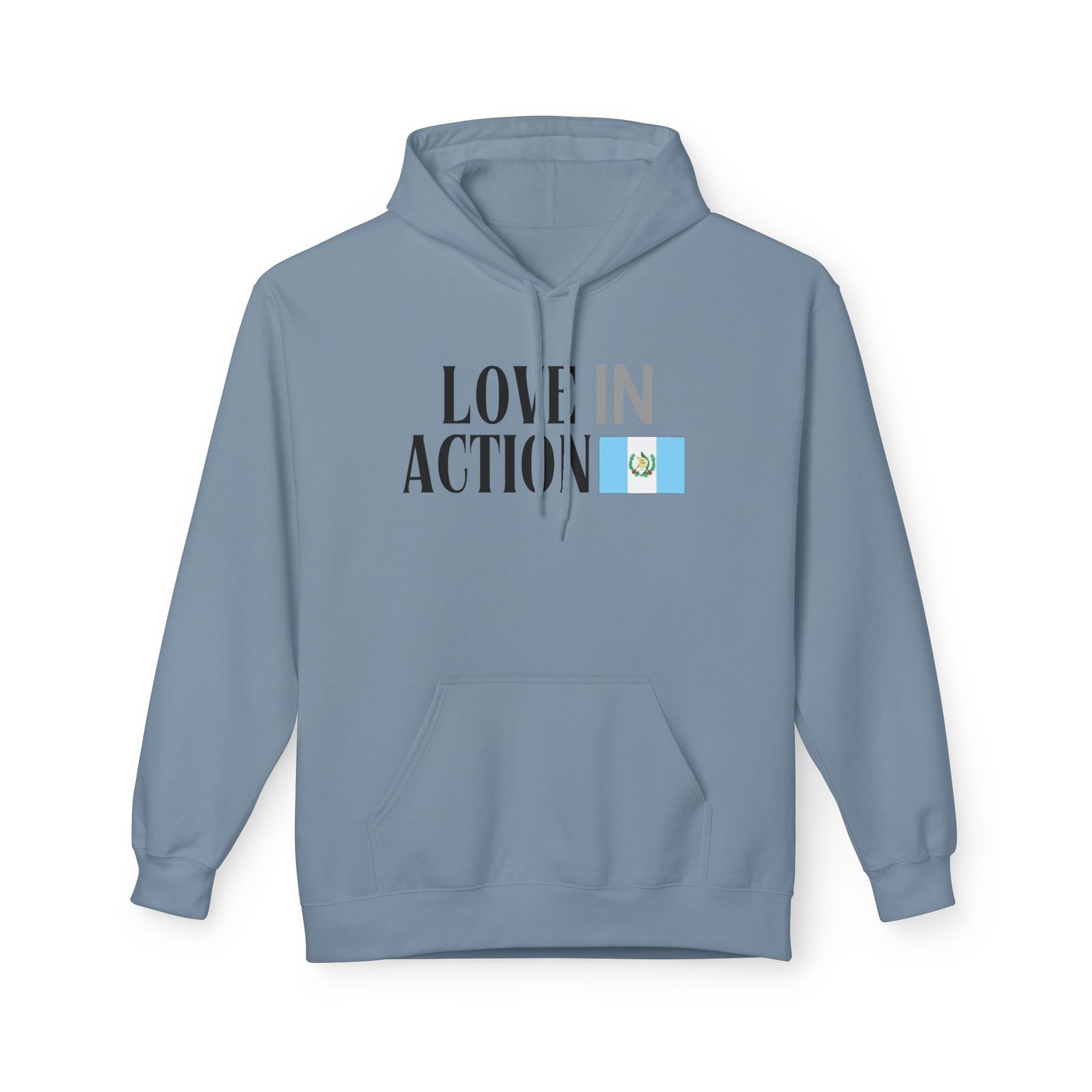 This midweight fleece hoodie carries the ‘Love in Action’ graphic with the Guatemalan flag—honoring the place where you’ll serve and the people you’ll walk beside. It feels lived-in from the first wear: warm but breathable, with a relaxed drape from dropped shoulders and a roomy pouch pocket for cold mornings and long service days.