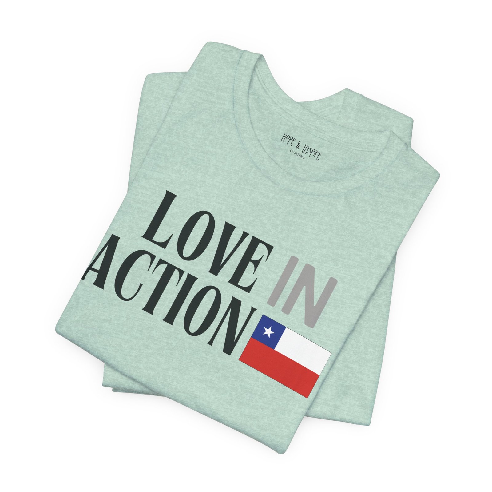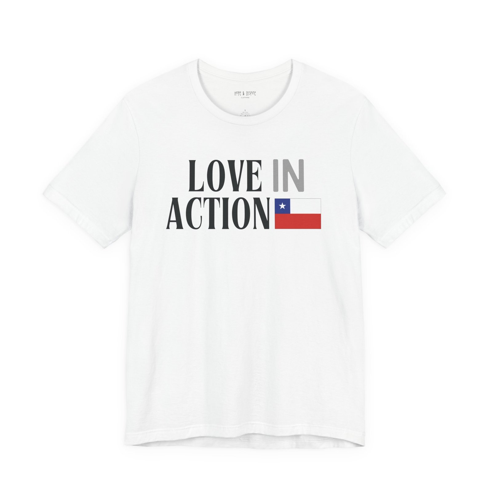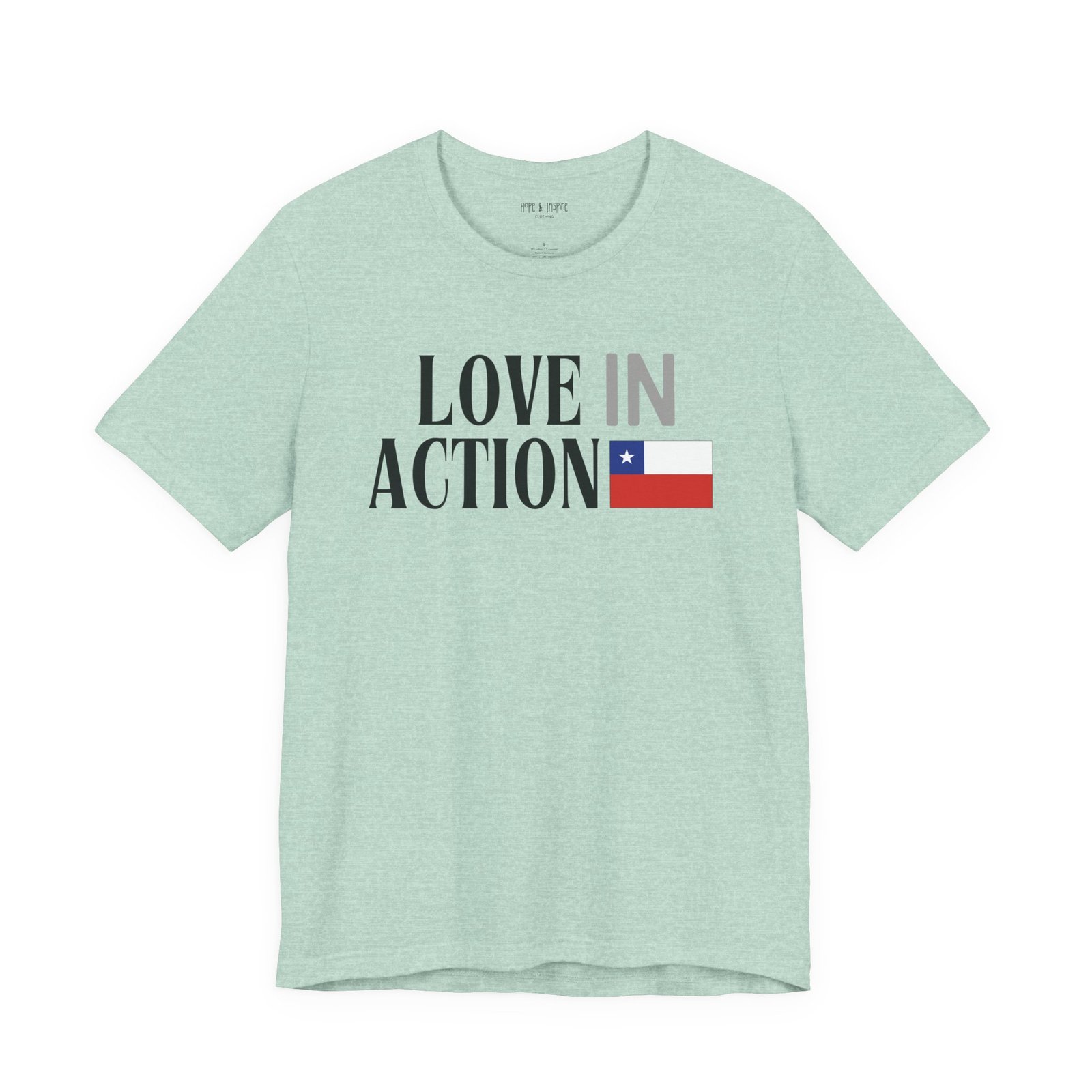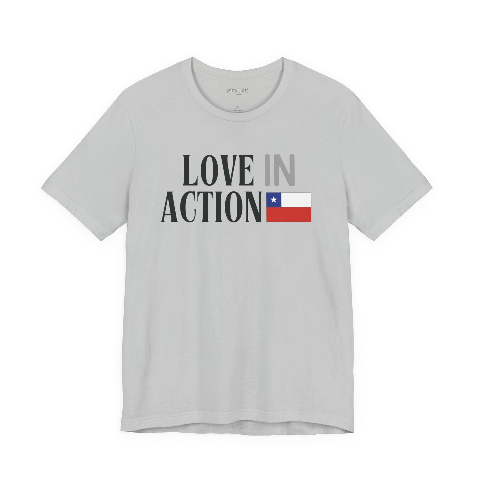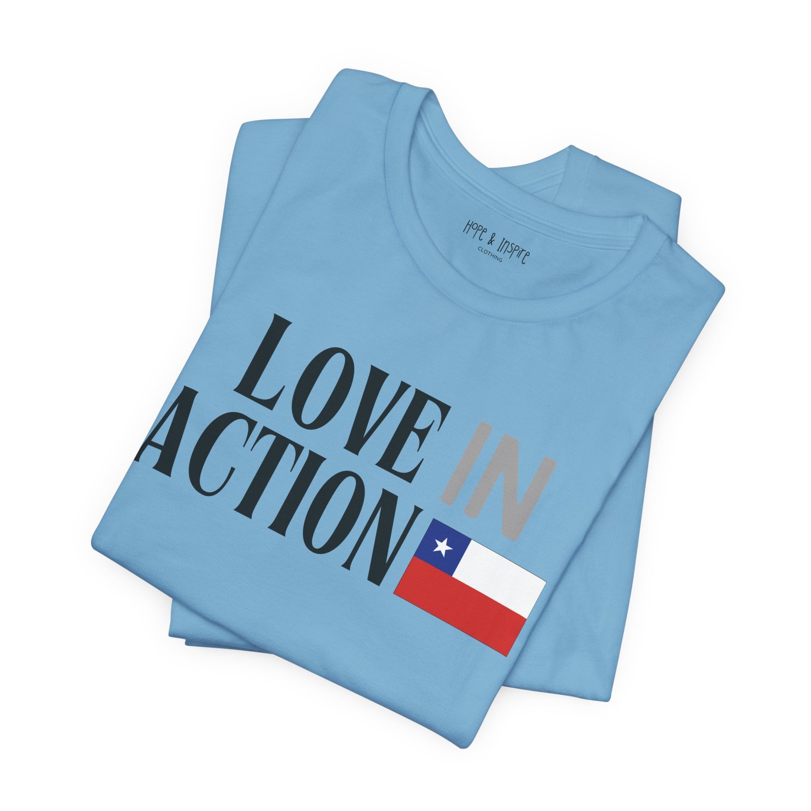The ‘Love in Action’ graphic features the Chilean flag—honoring the place where you’ll serve and the community you’ll stand alongside. Perfect for mission trips to Chile, international service projects, or carrying the memory of transformative work long after you return home.