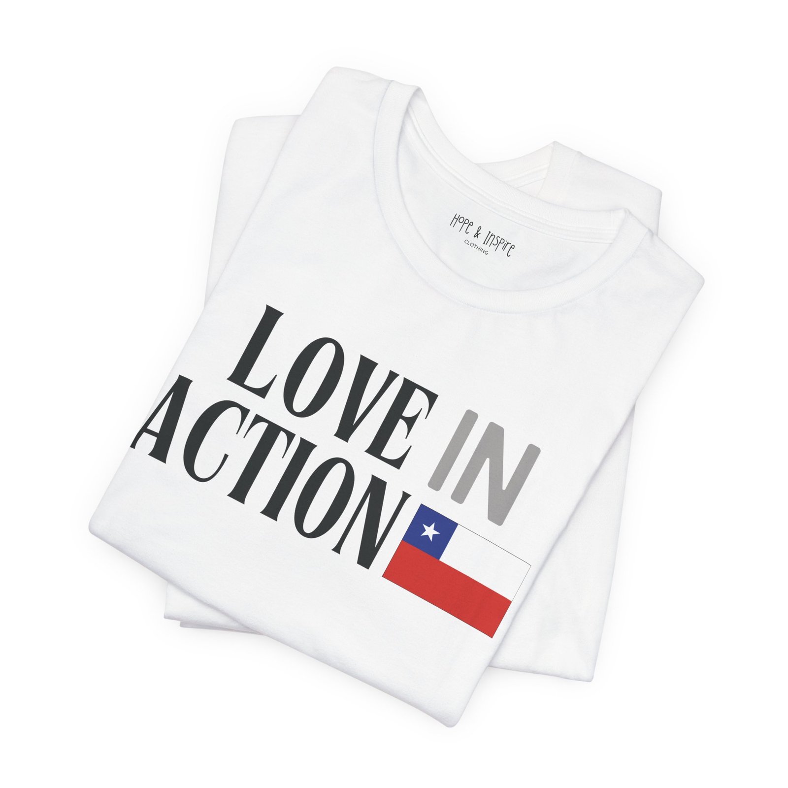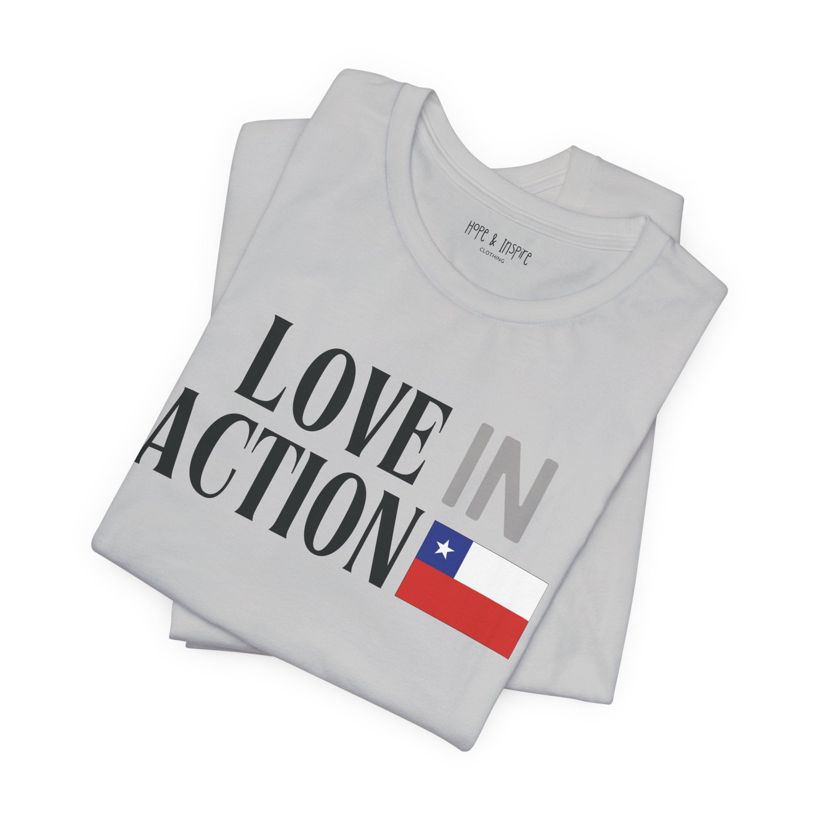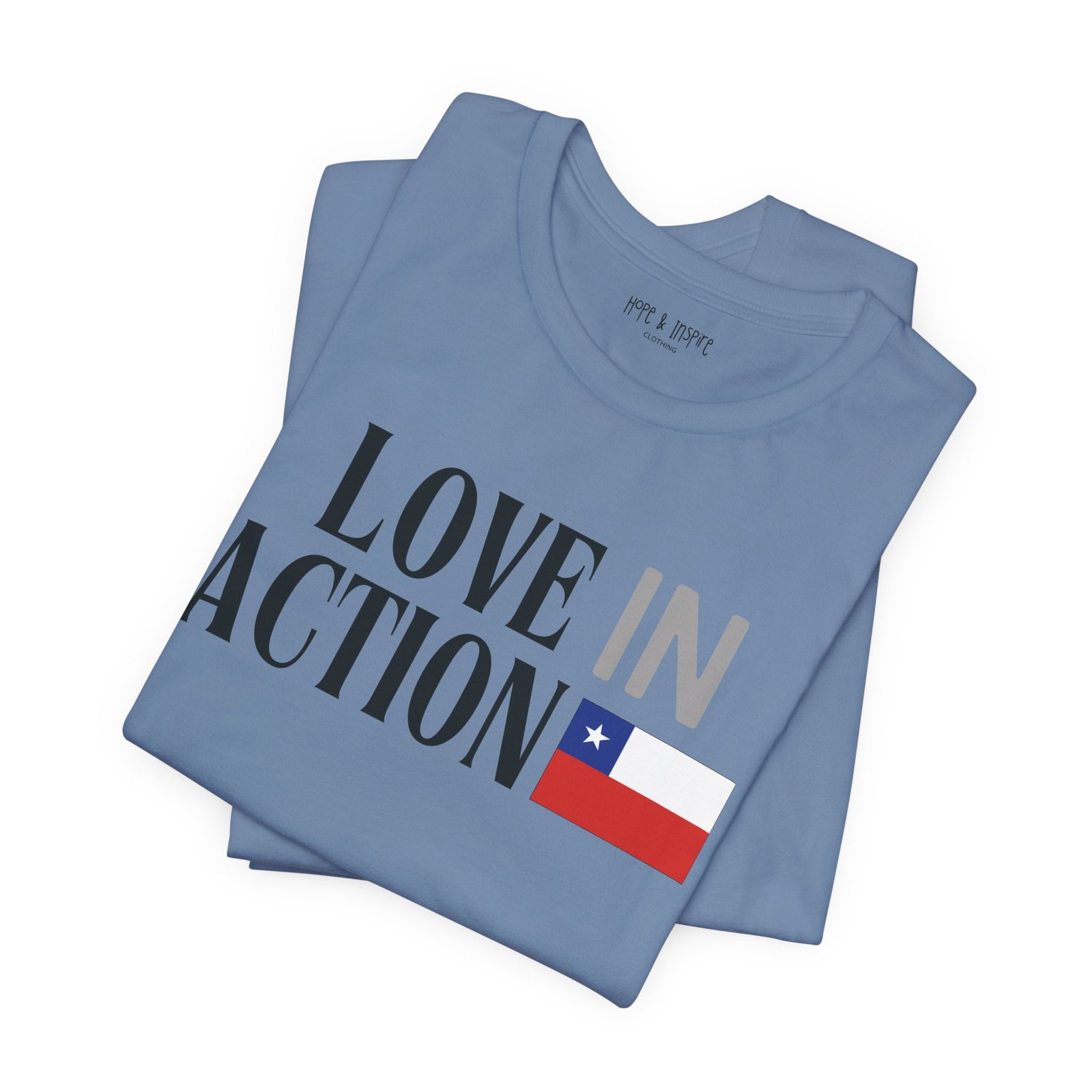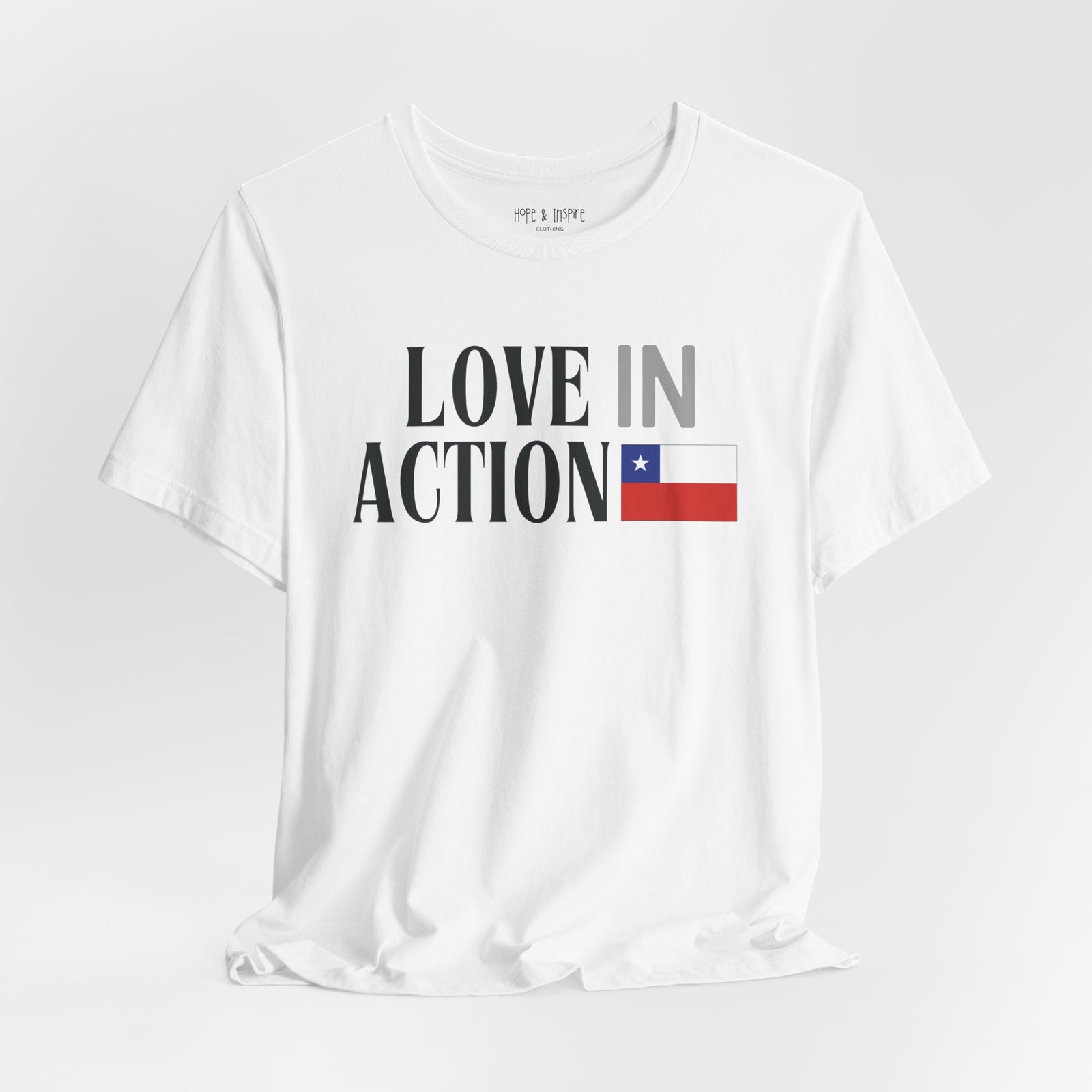 The ‘Love in Action’ graphic features the Chilean flag—honoring the place where you’ll serve and the community you’ll stand alongside. Perfect for mission trips to Chile, international service projects, or carrying the memory of transformative work long after you return home.