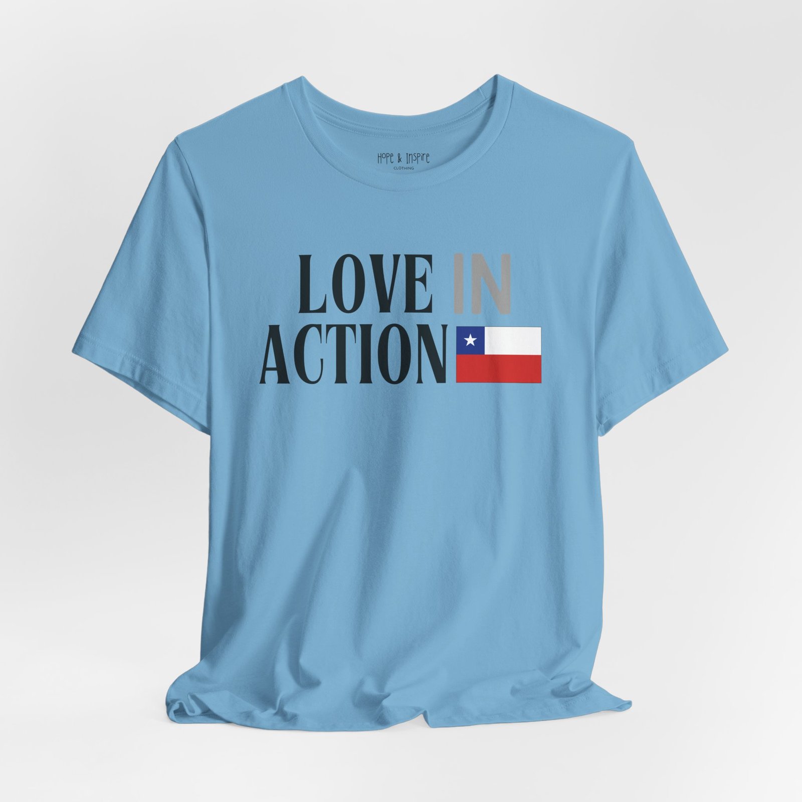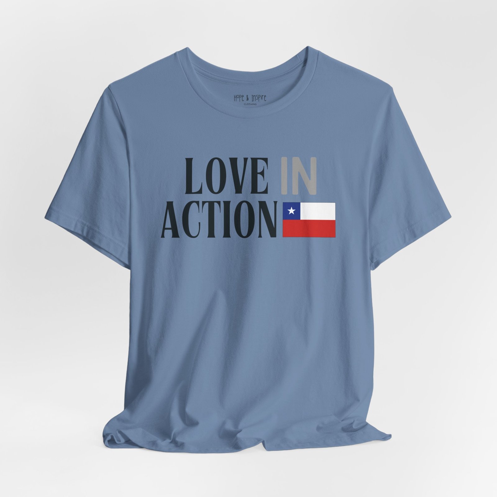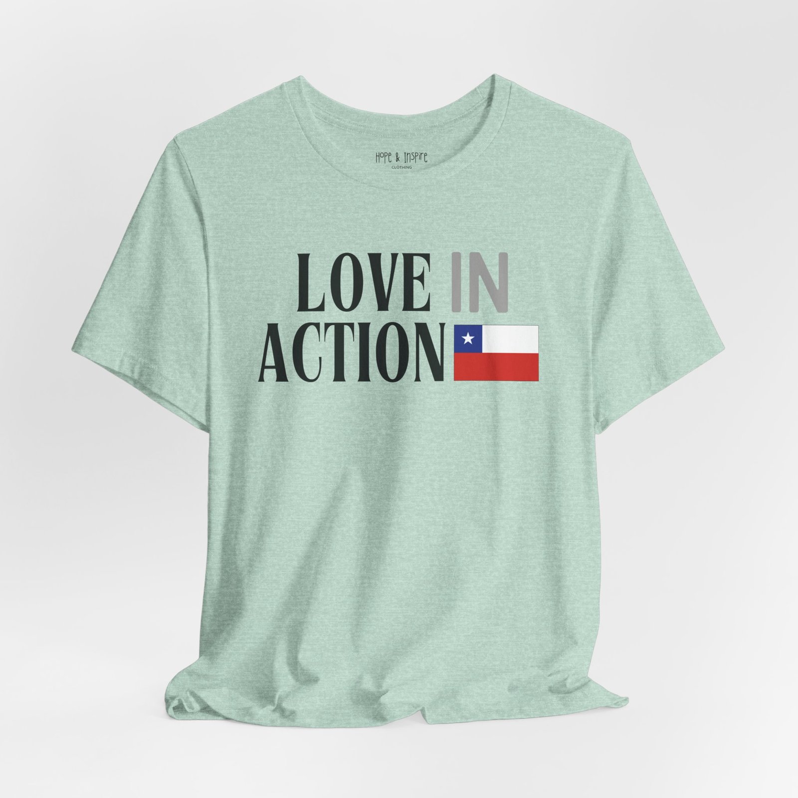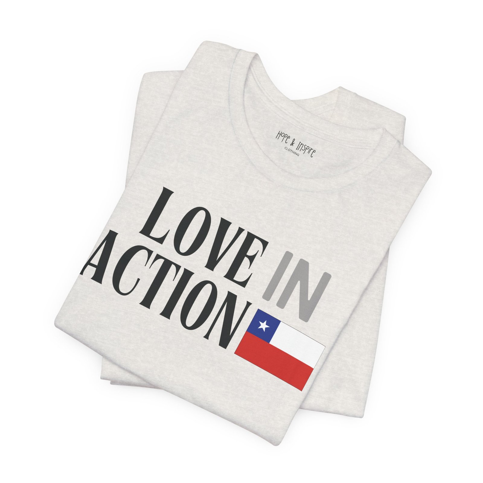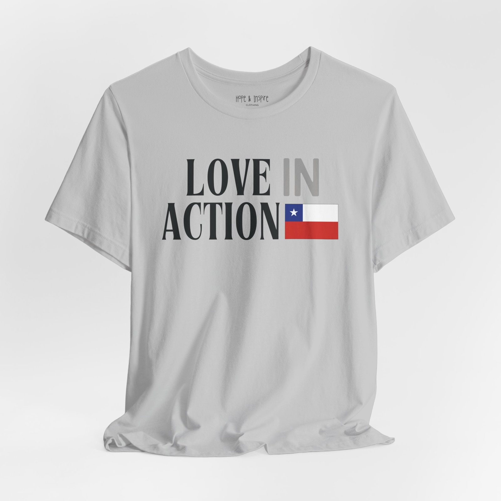 The ‘Love in Action’ graphic features the Chilean flag—honoring the place where you’ll serve and the community you’ll stand alongside. Perfect for mission trips to Chile, international service projects, or carrying the memory of transformative work long after you return home.