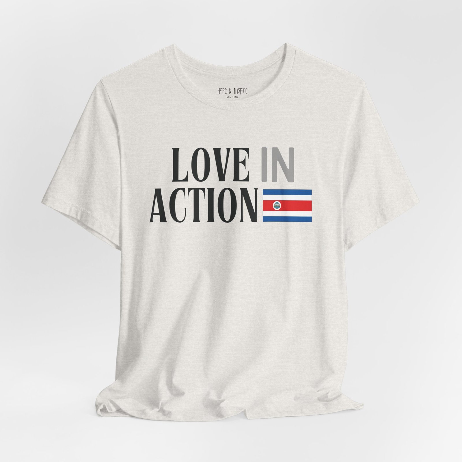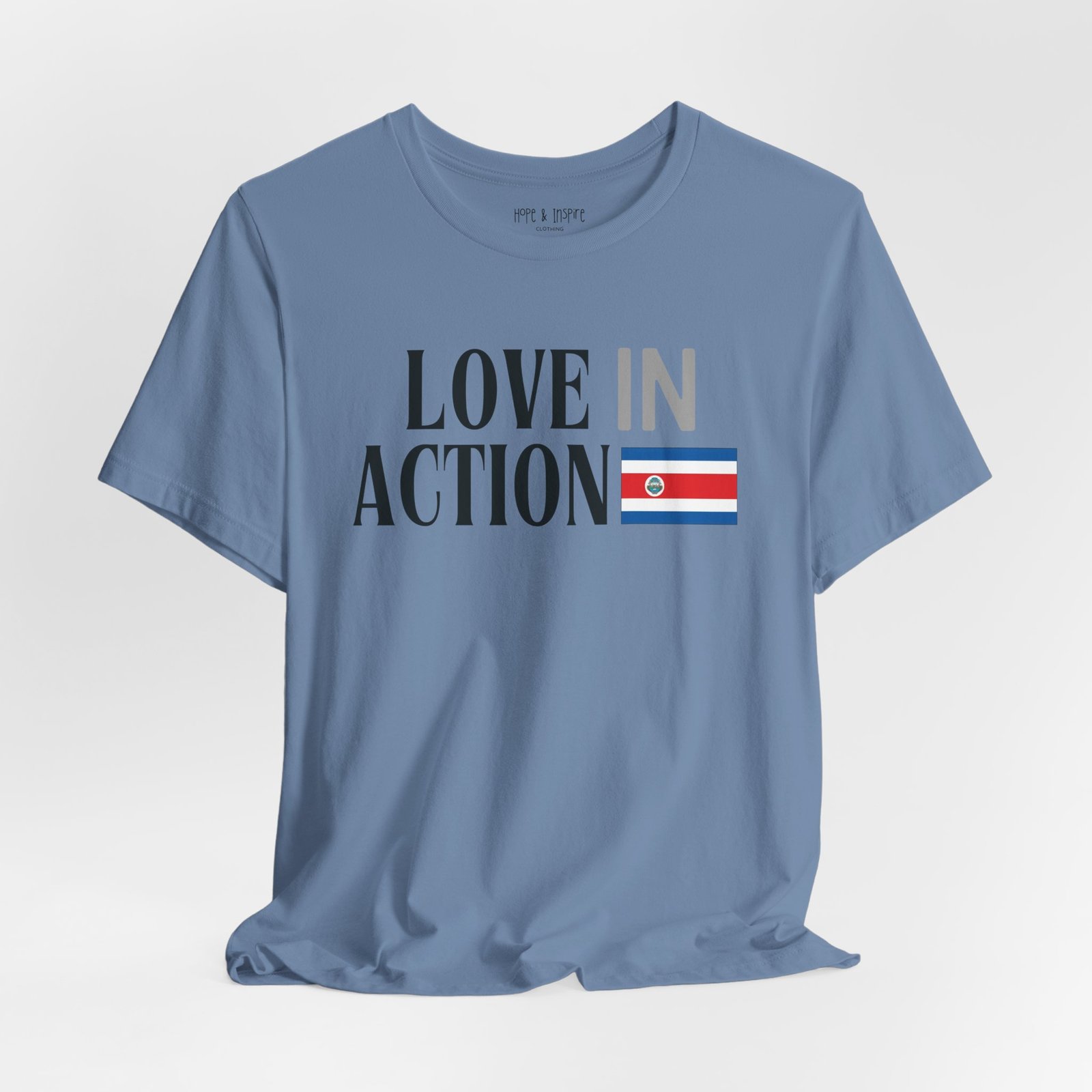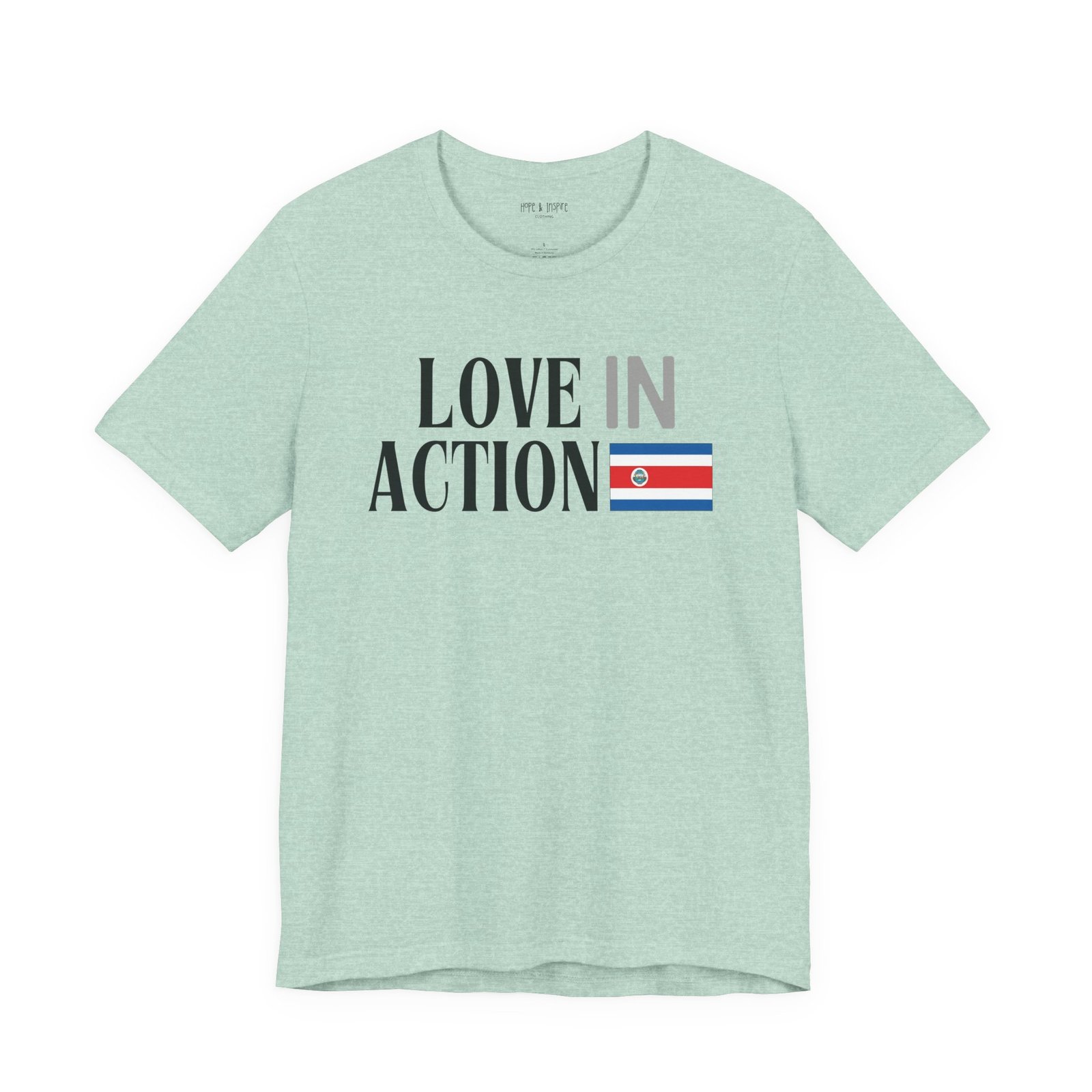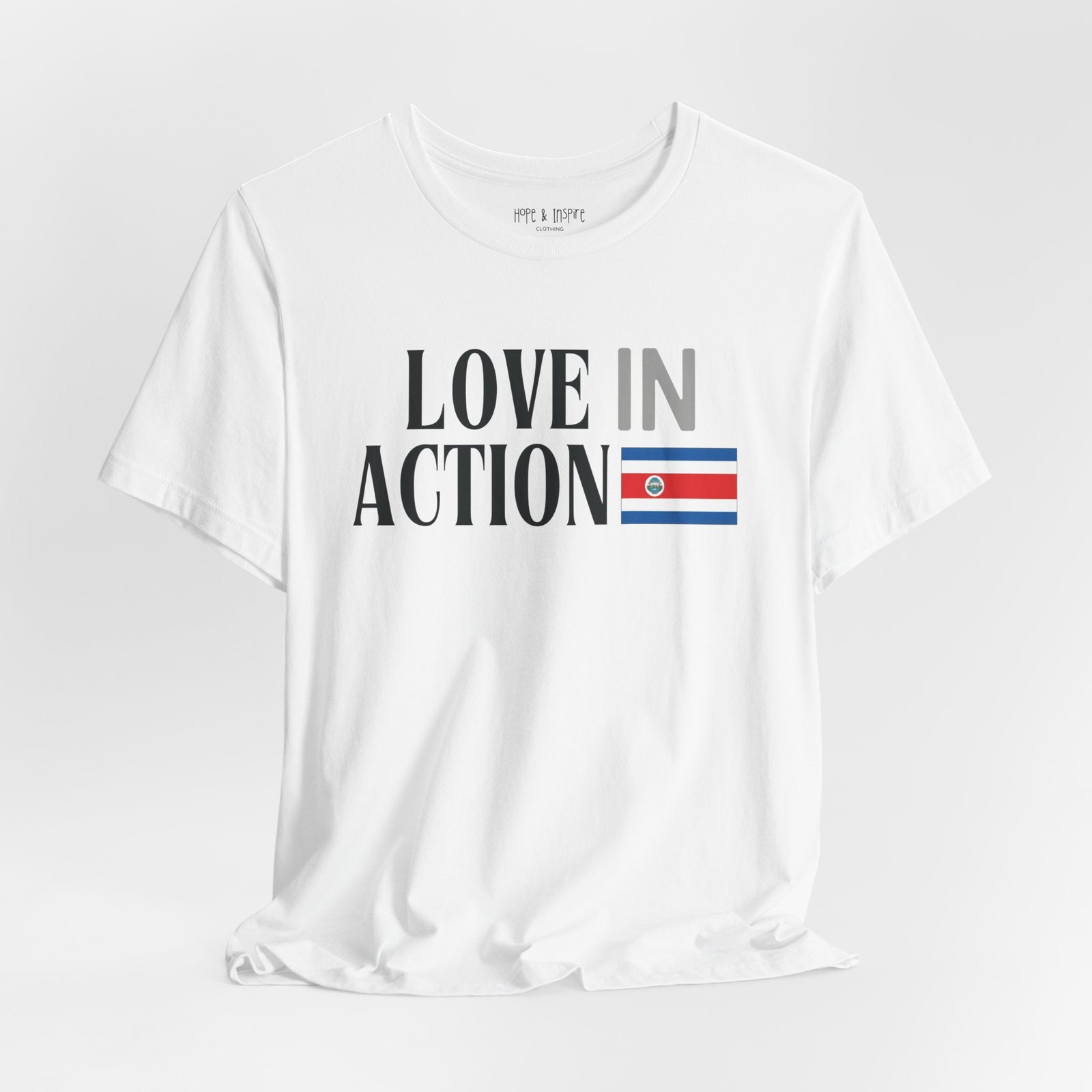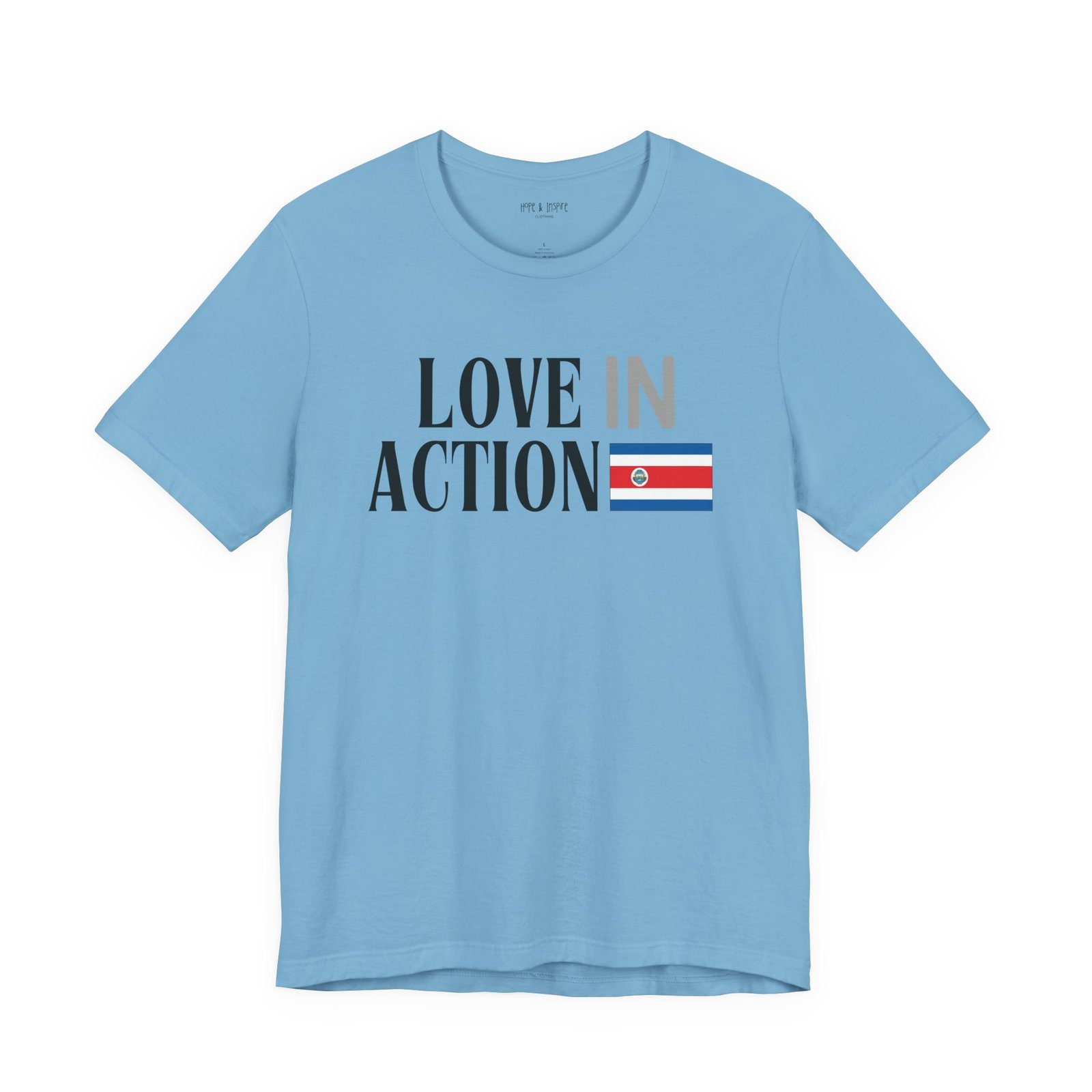 The ‘Love in Action’ graphic features the Costa Rican flag—honoring the place where you’ll serve and the community you’ll stand alongside. Perfect for mission trips to Costa Rica, international service projects, or carrying the memory of transformative work long after you return home.
