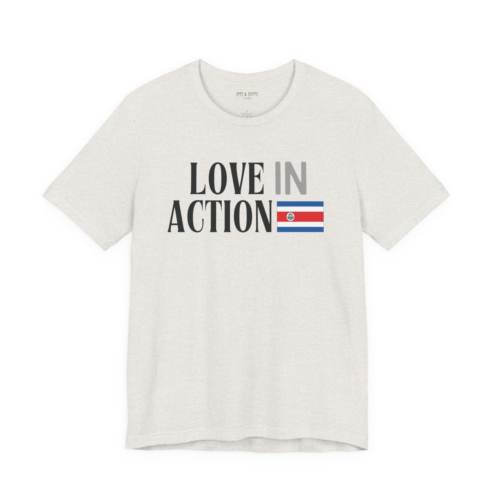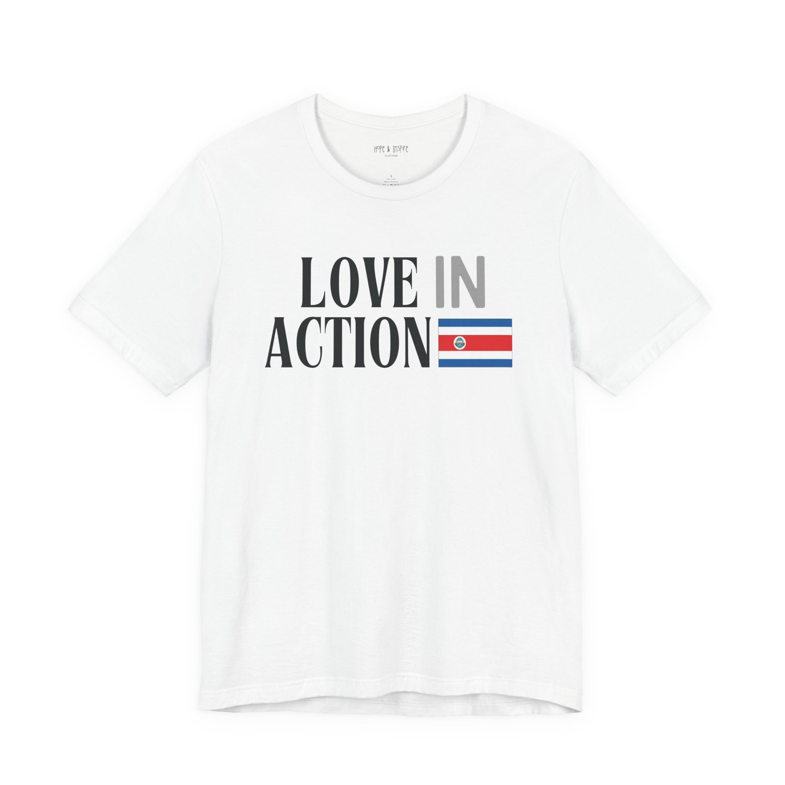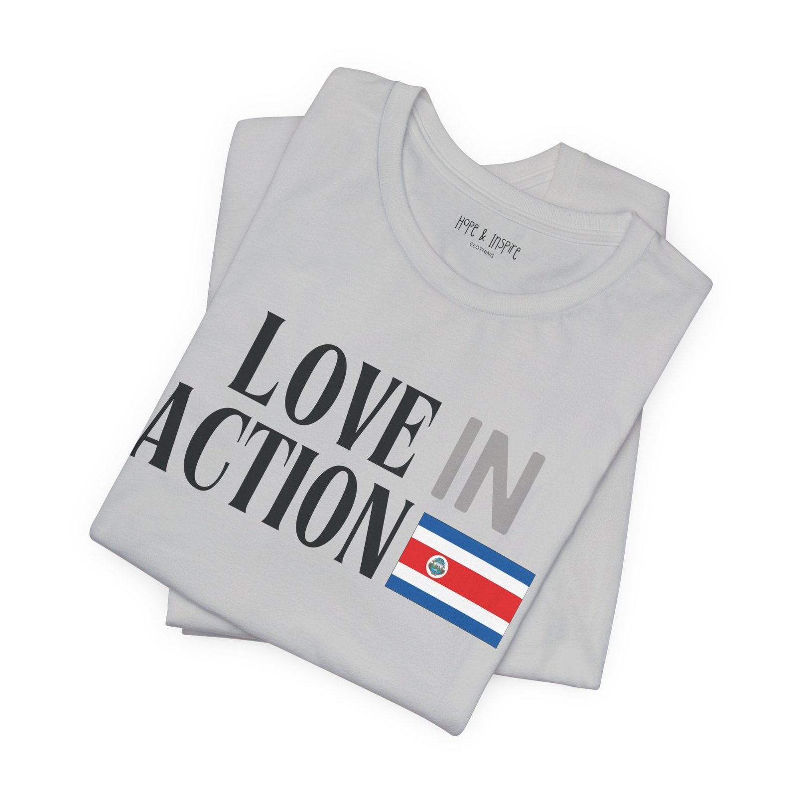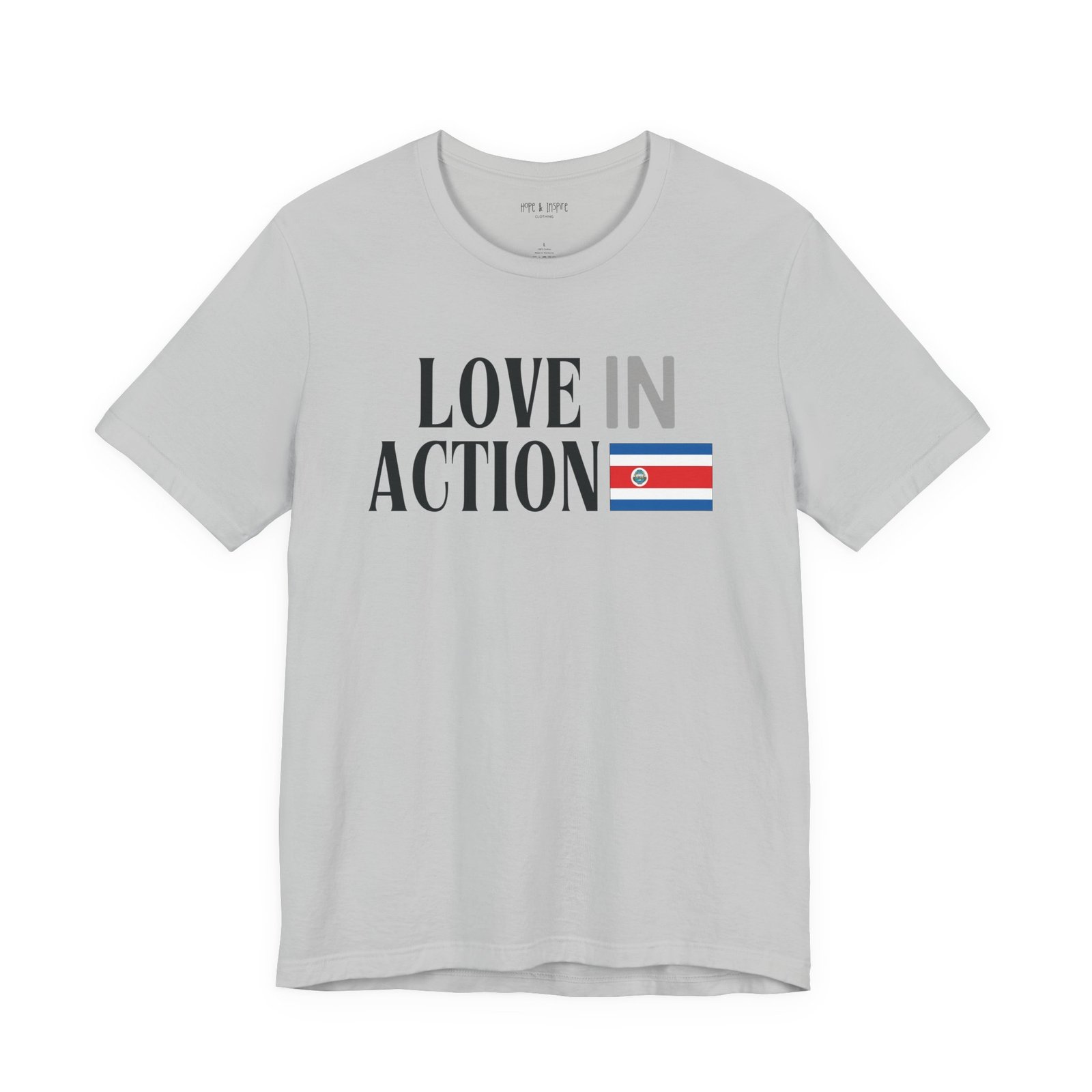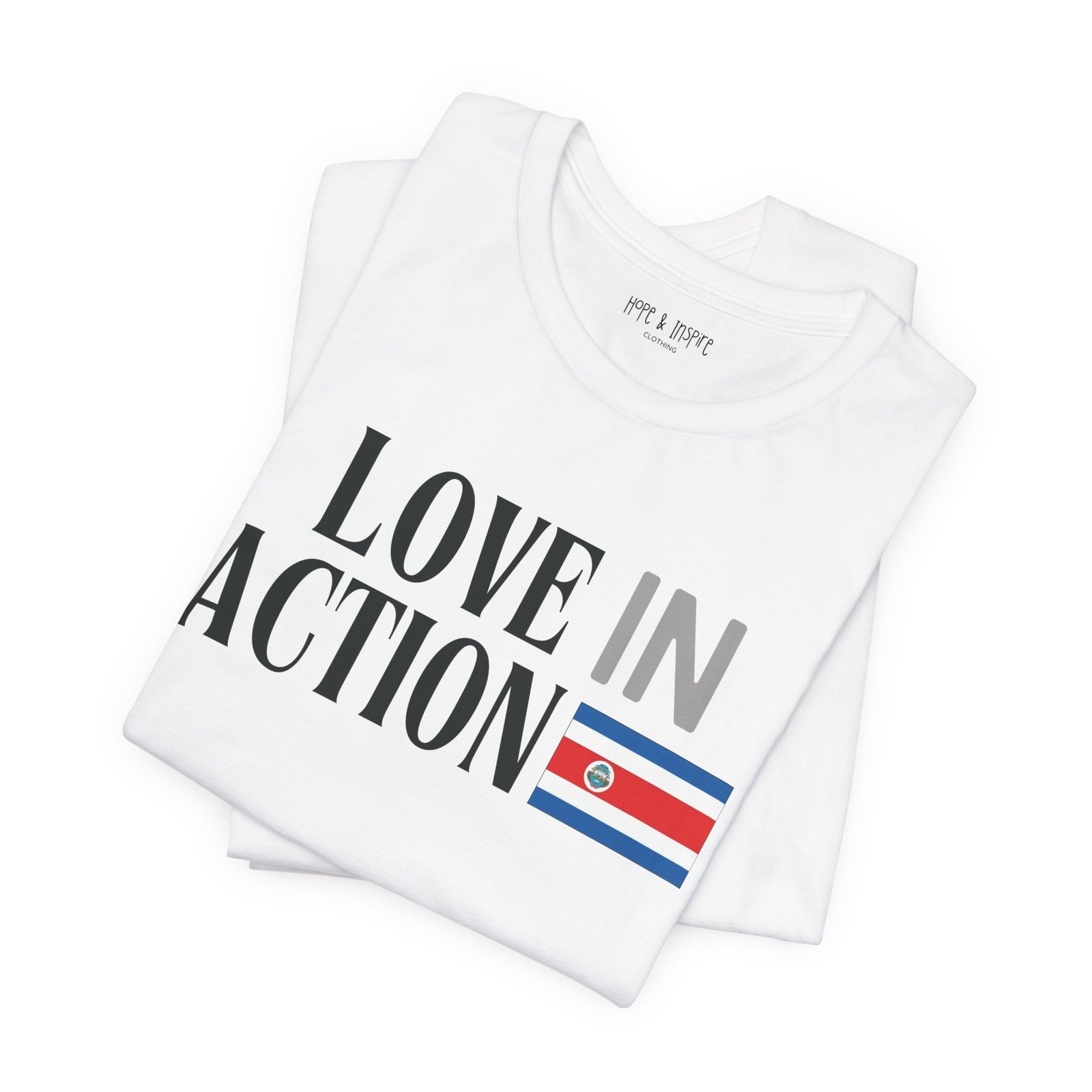 The ‘Love in Action’ graphic features the Costa Rican flag—honoring the place where you’ll serve and the community you’ll stand alongside. Perfect for mission trips to Costa Rica, international service projects, or carrying the memory of transformative work long after you return home.